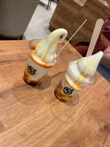 固めのプリンと、柔らかいソフトクリームがとてもよく合います。
