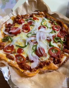 餃子の皮を使って、ピザを焼いてみたら大成功でした!軽くて食べやすくて、むちゃ くちゃ美味しかったです!