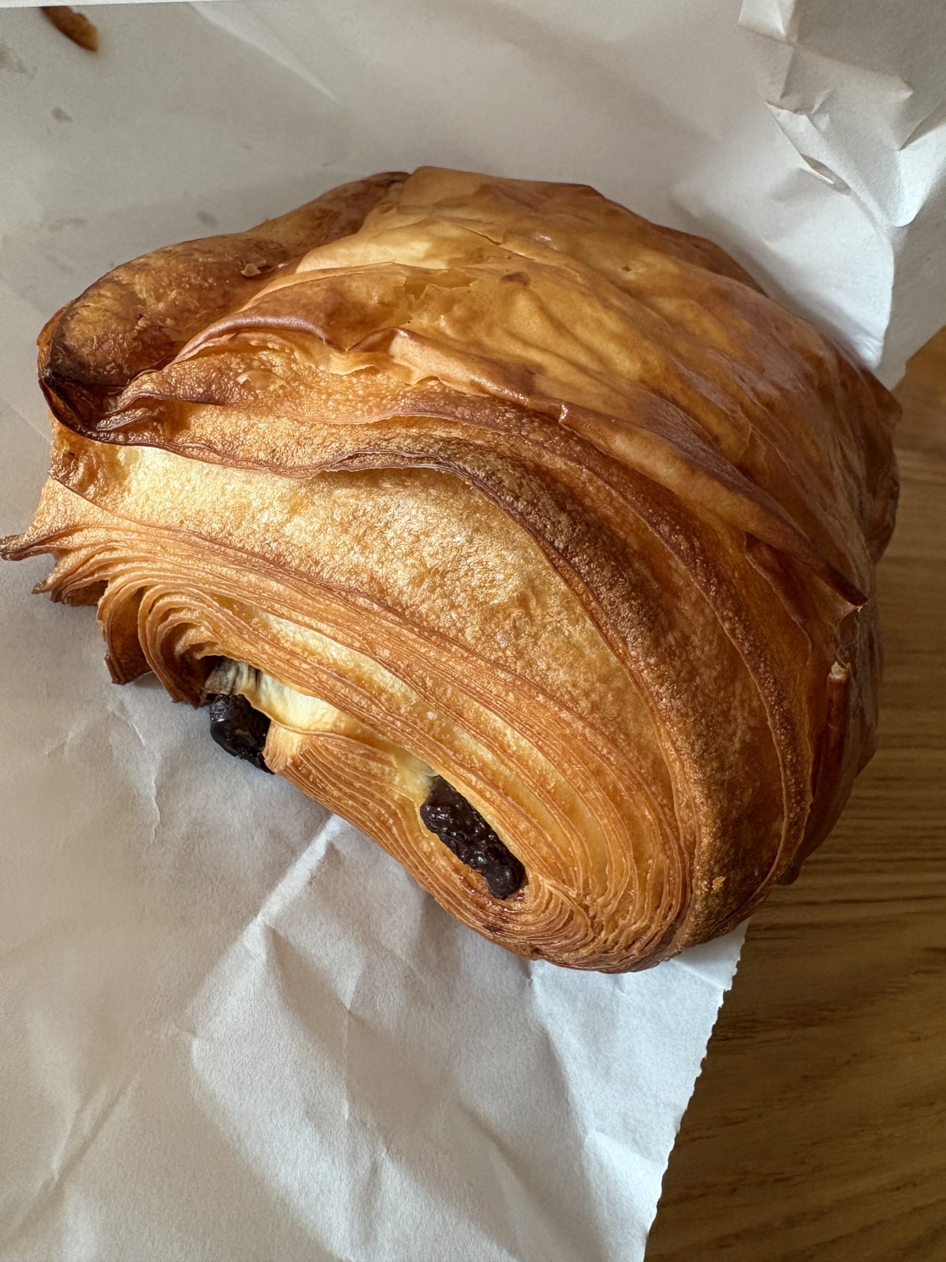 パン屋さんでチョコデニッシュを購入しました。何層もの層になっておりとてもサク サクで美味しかったです。